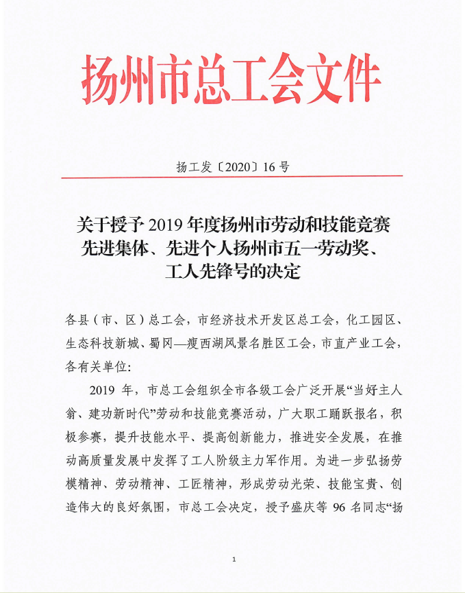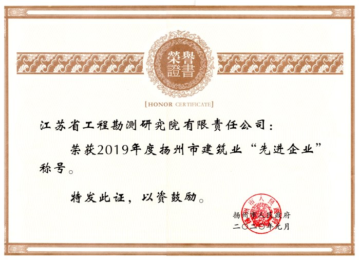 九州(中国)被评为2019年度“扬州市建筑业先进...